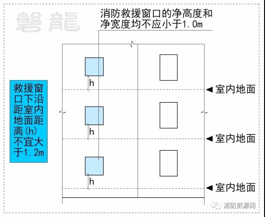 一、救援口的凈高度和凈寬度均不應小于1.0m,下沿距室內地面不宜大于1.2m;窗口的玻璃應易于破碎,并應設置在室外易于識別的明顯標志。(7.2.5)