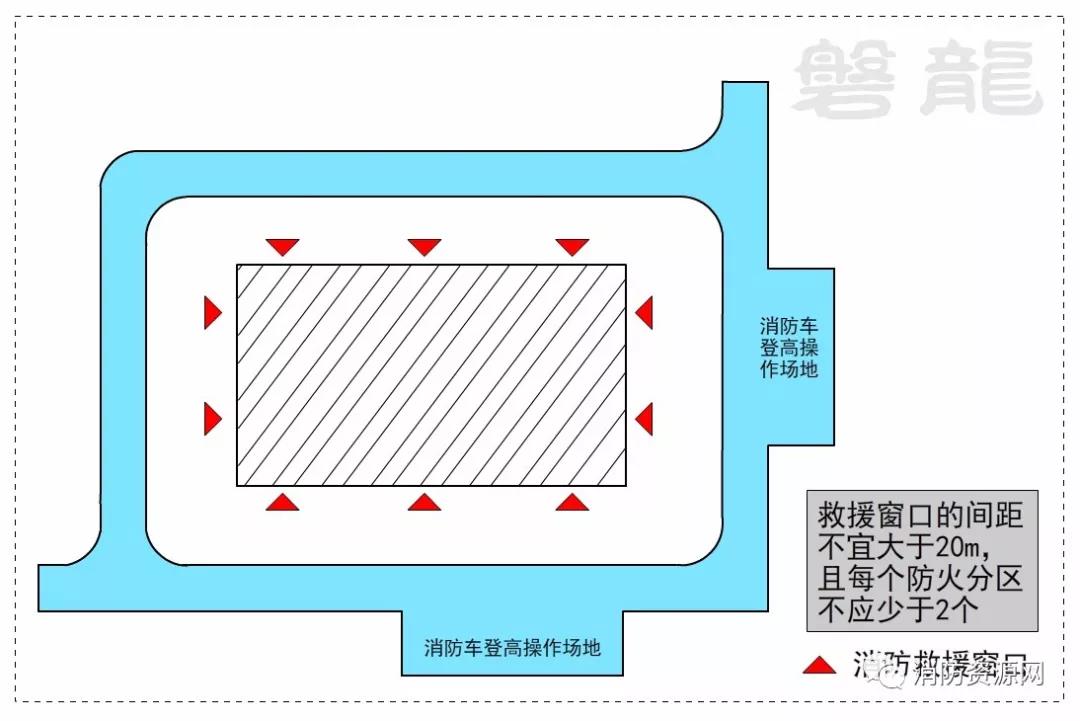二、救援口的間距不宜大于20m且每個(gè)防火分區不應少于2個(gè);設置位置應與消防車(chē)登高操作場(chǎng)地相對應。(7.2.5)