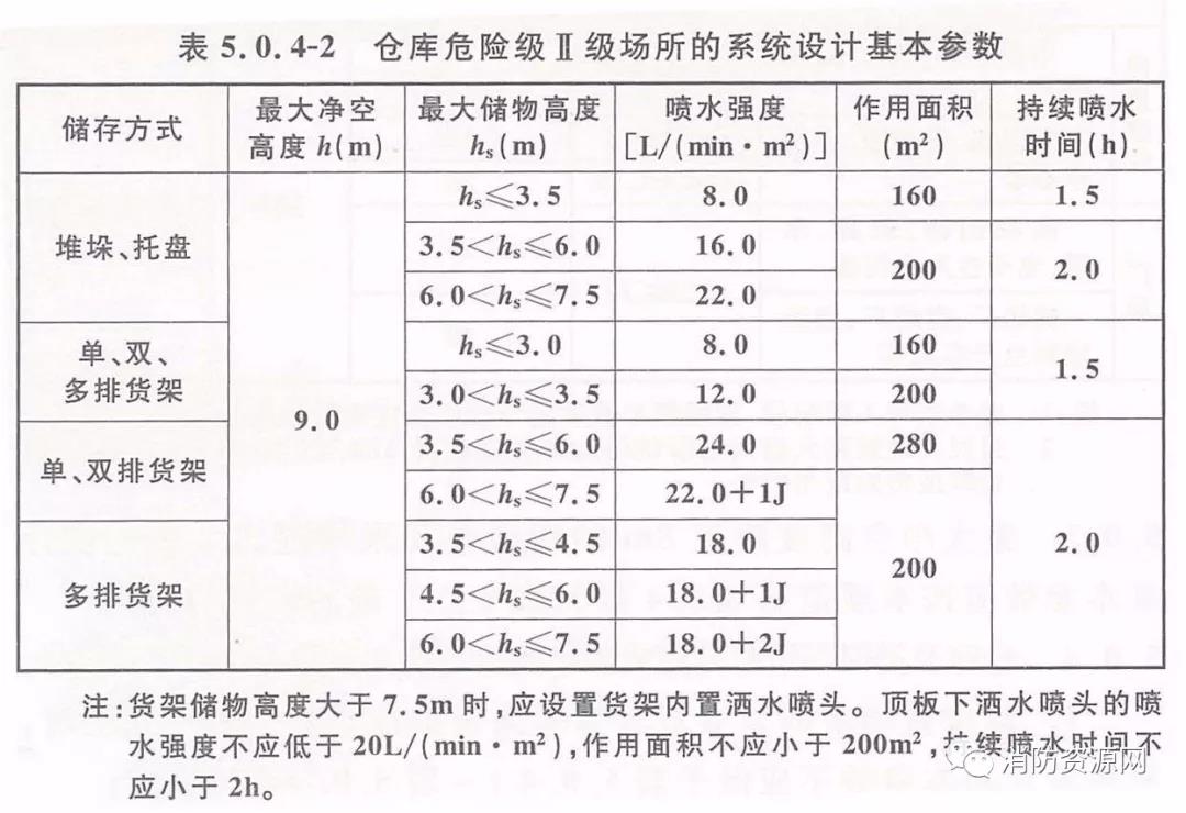 示例:表5.0.4-2中,最大凈空高度為9m的倉庫危險級Ⅱ級多排貨架倉庫,當最大貯物高度6.0m<hs≤7.5m時(shí),噴水強度為18+2J,18即為頂板下灑水噴頭的噴水強度。