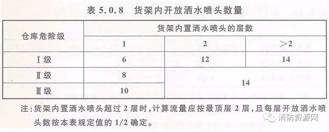 2、貨架內置噴頭的用水量,按“噴頭動(dòng)作個(gè)數法“進(jìn)行計算,當貨架內置灑水噴頭為1層時(shí),開(kāi)放灑水噴頭的數量按表5.0.8取值;2層以上時(shí),計算流量應按最頂層2層,且每層開(kāi)放噴頭數按表5.0.8規定值的1/2確定。