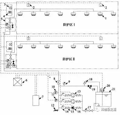 1——開(kāi)式細水霧噴頭;2——火災探測器;3——噴霧指示燈;4——火災聲光報警器;5——分區控制閥組;6——火災報警控制器;7——消防泵控制柜;8——控制閥(常開(kāi));9——壓力表;10——水流傳感器;11——壓力開(kāi)關(guān);12——泄水閥(常閉);13——消防泵;14——止回閥;15——柔性接頭;16——穩壓泵;17——過(guò)濾器;18——安全閥;19——泄放試驗閥;20——液位傳感器;21——儲水箱;22——分區控制閥(電磁/氣動(dòng)/電動(dòng)閥)